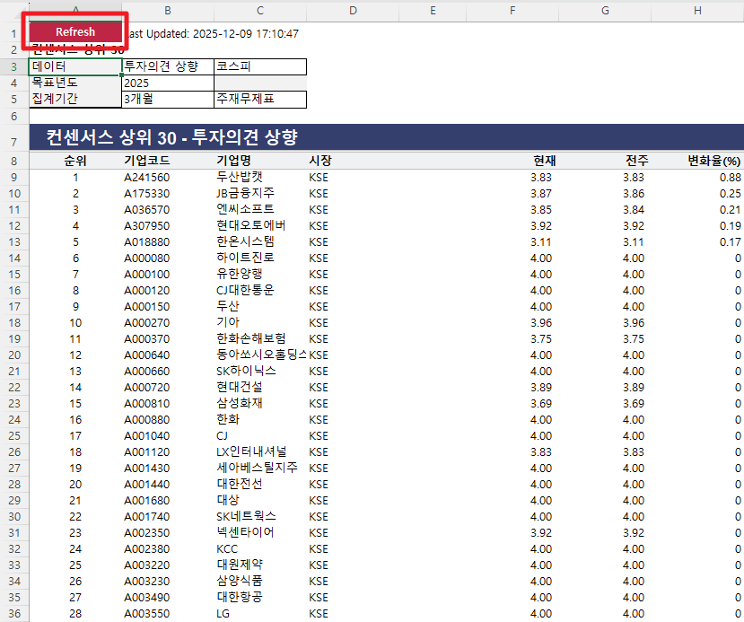 설정하신 조건에 따라 선택한 대상의 시계열 데이터가 엑셀 시트에 표 형태로 출력됩니다.