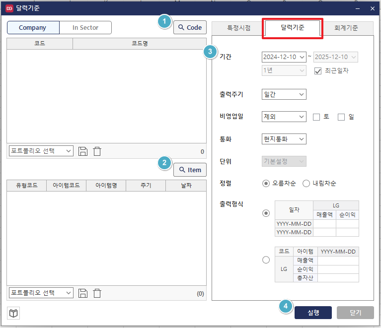비영업일 처리, 통화(현지통화·원화·달러), 단위, 정렬(오름차순/내림차순),출력형식(날짜·코드·아이템을 행/열 중 어디에 둘지)을 필요에 맞게 설정합니다.