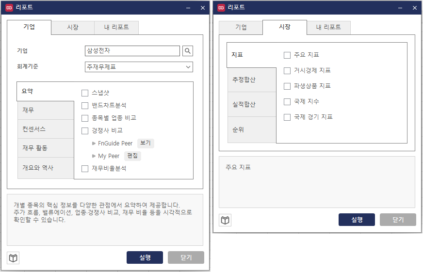 기업과 시장의 핵심 데이터를 요약한 리포트를 조회할 수 있으며,종목 비교, 재무 분석, 경제 지표 등 다양한 분석 자료를 제공합니다.