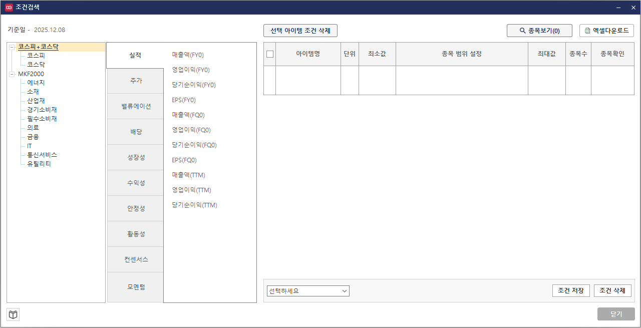 조건검색(Screener): 원하는 조건에 맞는 종목을 빠르게 추출
