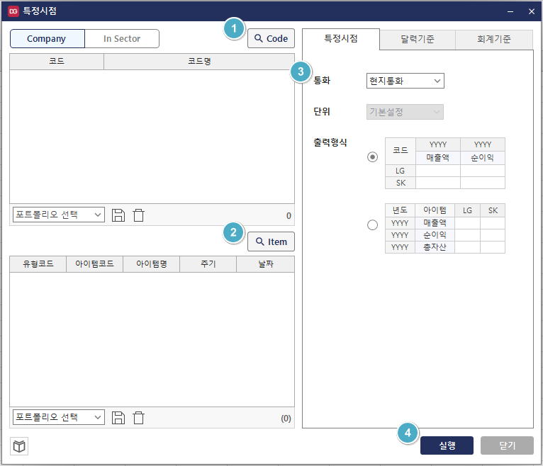 코드, 아이템, 통화 및 출력형식 설정이 완료되면 하단의 실행 버튼을 클릭합니다.