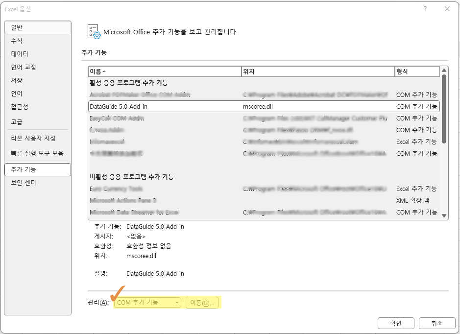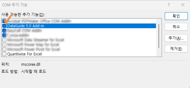 팝업 창에서 DataGuide 5.0 Add-in 항목에 체크 표시가 되어 있는지 확인하고, 체크가 되어 있지 않다면 체크 후 [확인]을 누릅니다.